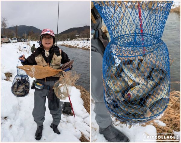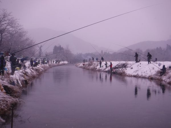 昨日、あまご漁の解禁を迎えました。朝から雪がちらつき、一面が白く染まる厳しい寒さの中、神海橋上流(餌釣り)には約80名、谷汲山大橋上流(ルアー・フライ)には約40名の釣り人の皆さまが集まり、放流される魚を待ちわびながら、早朝より釣りを楽しまれていました。手がかじかむような冷え込みの中でしたが、解禁日らしい活気ある一日となりました。 今後の放流予定は、2月15日(日)、2月21日(土)を予定しております。 ※天候等により変更となる場合がありますので、最新情報は随時ホームページにてお知らせいたします。(写真は神海橋上流) |