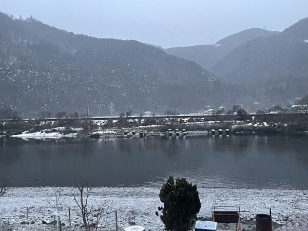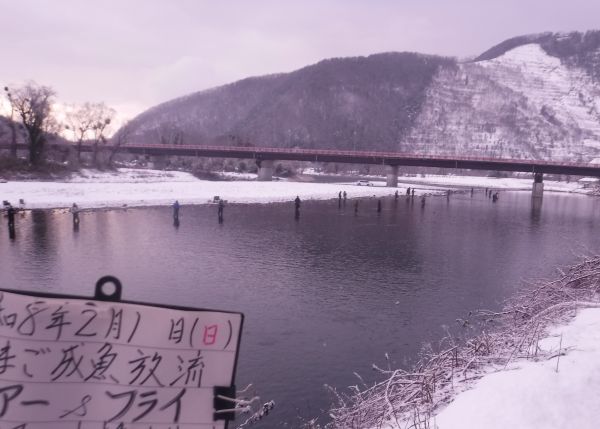 昨日、あまご漁の解禁を迎えました。朝から雪がちらつき、一面が白く染まる厳しい寒さの中、神海橋上流(餌釣り)には約80名、谷汲山大橋上流(ルアー・フライ)には約40名の釣り人の皆さまが集まり、放流される魚を待ちわびながら、早朝より釣りを楽しまれていました。手がかじかむような冷え込みの中でしたが、解禁日らしい活気ある一日となりました。 今後の放流予定は、2月15日(日)、2月21日(土)を予定しております。 ※天候等により変更となる場合がありますので、最新情報は随時ホームページにてお知らせいたします。(写真は神海橋上流) |